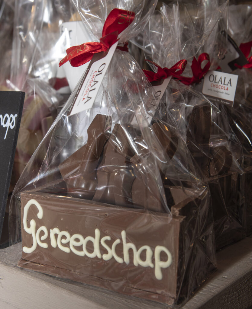 Terug in de winkel kijken we nog een keer naar het mooie assortiment en proeven we een stukje van die heel lekkere chocolade. Ook voor klanten die vegan chocola willen kopen is er een passend aanbod.